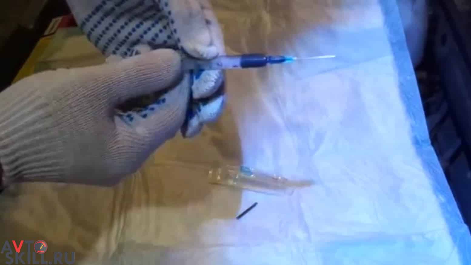 Чтобы смазка лучше выходила из шприца, ее нагревают до 40 градусов. Иглу шприца придерживают, иначе при нажатии она может вылететь от сильного давления.