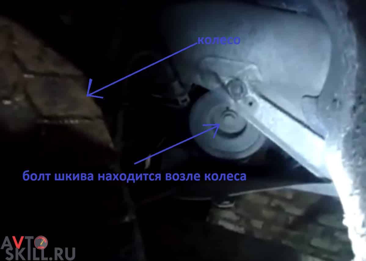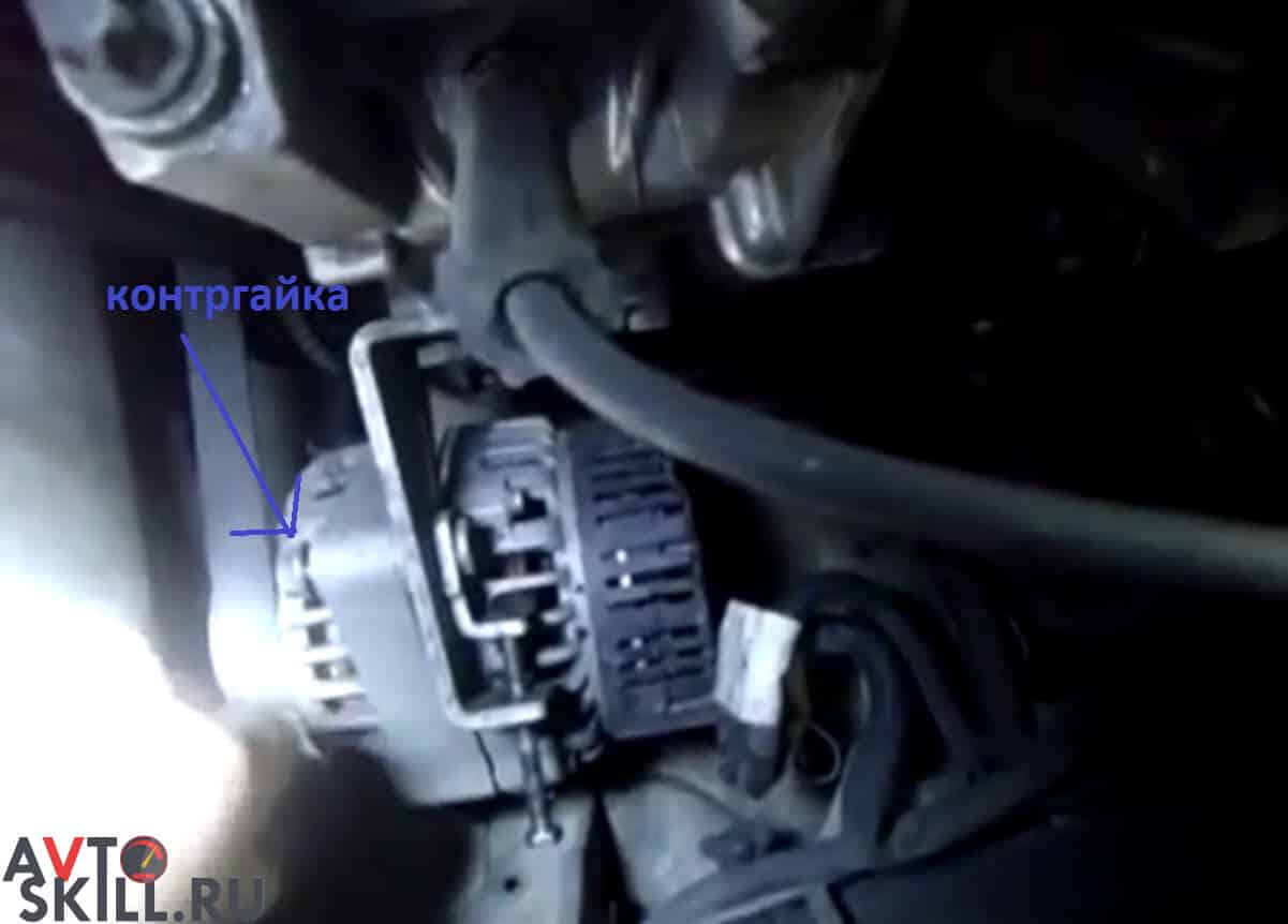 Далее при помощи одетой на удлинитель головки ослабляют контргайку ременного натяжителя.