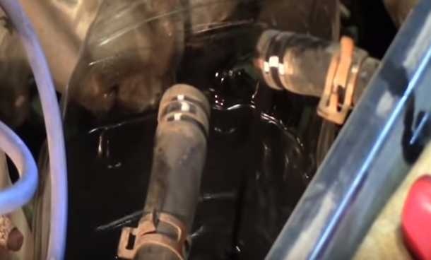 Затем аккумулятор отключается, после чего из резервуара выкачивается максимально возможное количество старого масла. После опорожнения бака необходимо открутить крепления и отсоединить патрубки, которые идут к баку. После снятия бака его можно промыть дизельным топливом для удаления грязи.