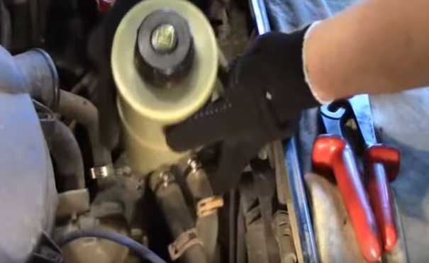 После снятия одного из шлангов масло стекает в установленную емкость, другой шланг снимается, бак снимается, а шланги помещаются в емкость с жидкостью. Если слитая жидкость имеет черный цвет и в ней видна металлическая стружка, необходимо в ближайшее время заменить насос гидроусилителя руля.