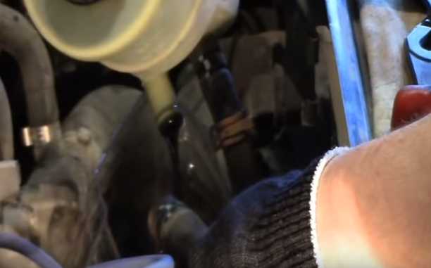 Для замены масла в ГУР тоже неплохо пригласить помощника. Для замены масла необходимо освободить доступ к бачку гидроусилителя (протолкнуть вентиляционную трубку, ослабить хомут на ней гаечным ключом).