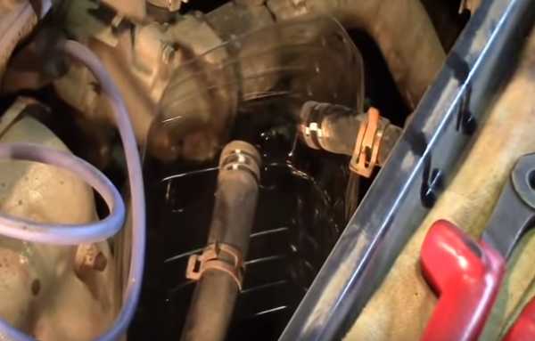 4. Плотно поместите контейнер на дно бака. Снимаем шланги по очереди и сливаем жидкость в емкость.