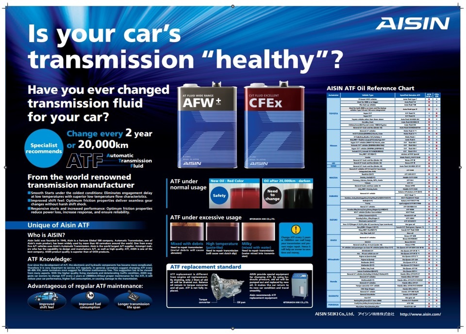 Производитель рекомендует производить замену масла Aisin в АКПП не реже одного раза в 20 000 км пробега или один раз в 2 года, в зависимости от того, что наступит раньше. При этом приоритет отдается полной замене масла в АКПП с помощью специальной установки.
