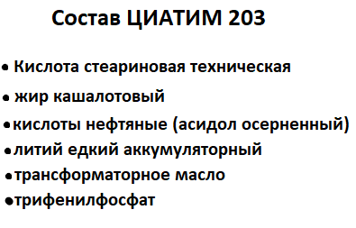 В состав Циатима-203 входят продукты нефтепереработки и литиевое мыло, прошедшее необходимый процесс загущения.